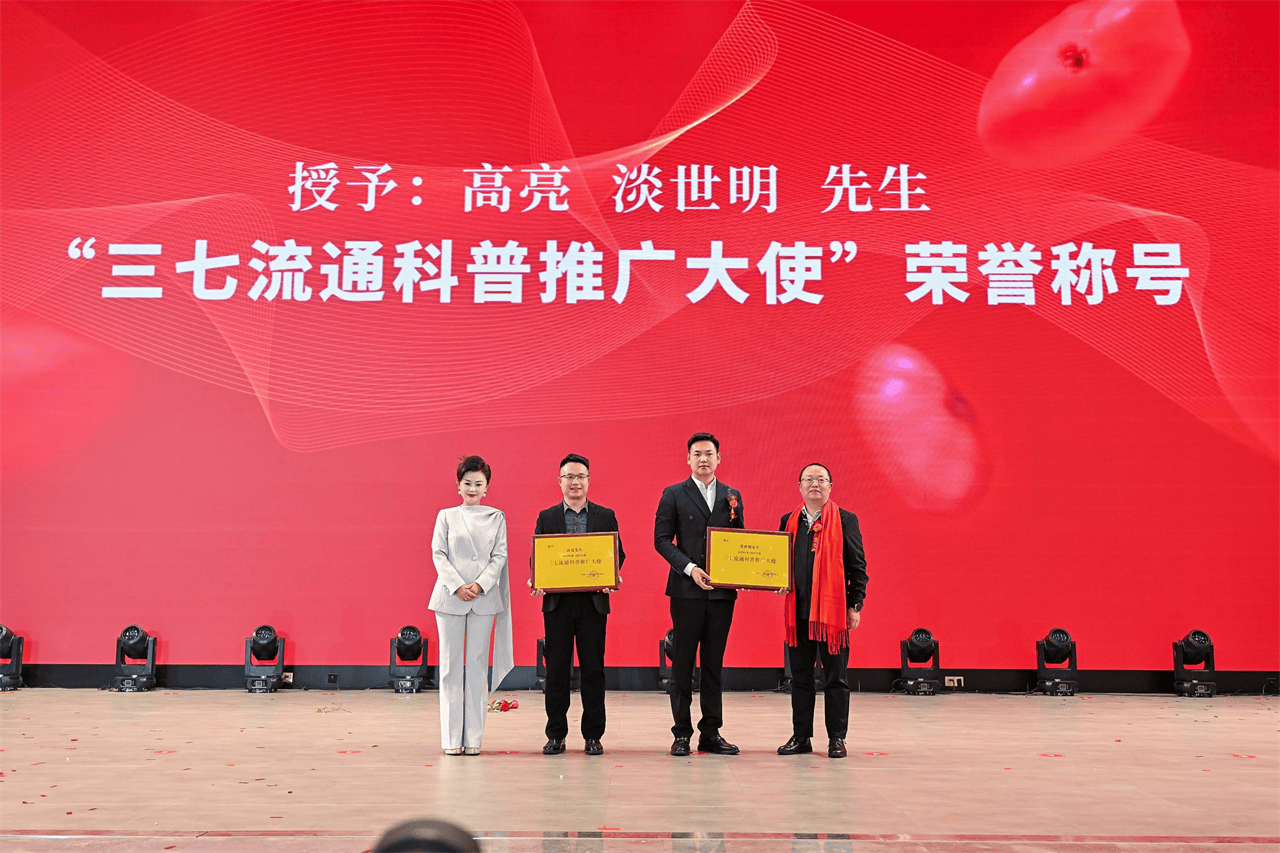 此外,文山三七和中药产业协会为河南省健康产业协会亚健康管理分会副会长高亮、淡世明授予“三七流通科普推广大使”称号,以表彰二人在推动三七产业流通与科普传播中的突出贡献。